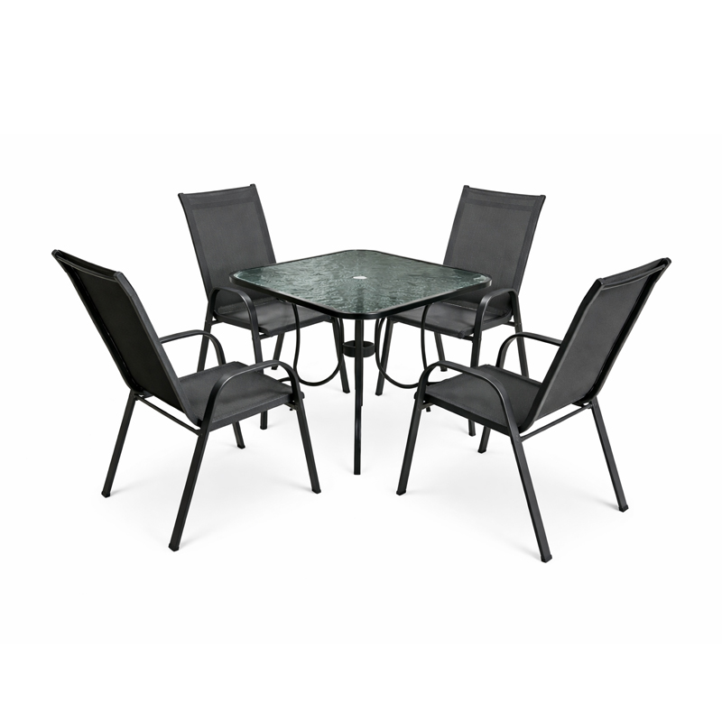 Градинарски сет Riviera 4+1: маса 90×90×72cm и 4 столици 55×72×92cm со 2×1 Textilene ткаенина. Челична рамка 42×14 и 27×15mm со прашкаста обработка. KD монтажа.