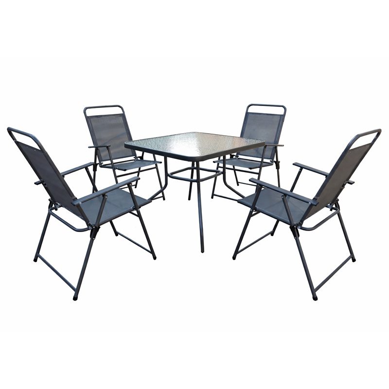 Градинарски сет 5 дела: маса и 4 столици со челична рамка и ткаенина за надворешна употреба. Прашкасто обложена конструкција. Погоден за дворови, тераси и угостителски простори.